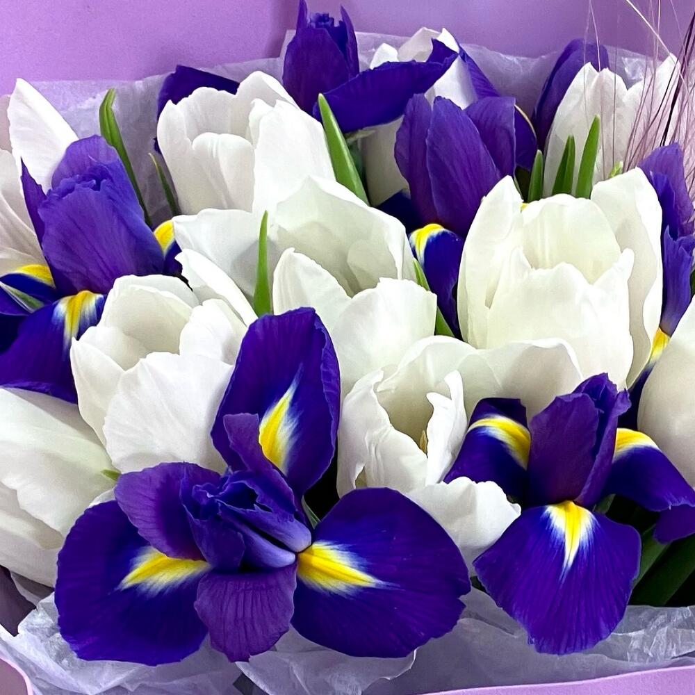 Легкий весенний букет из тюльпанов и ирисов.